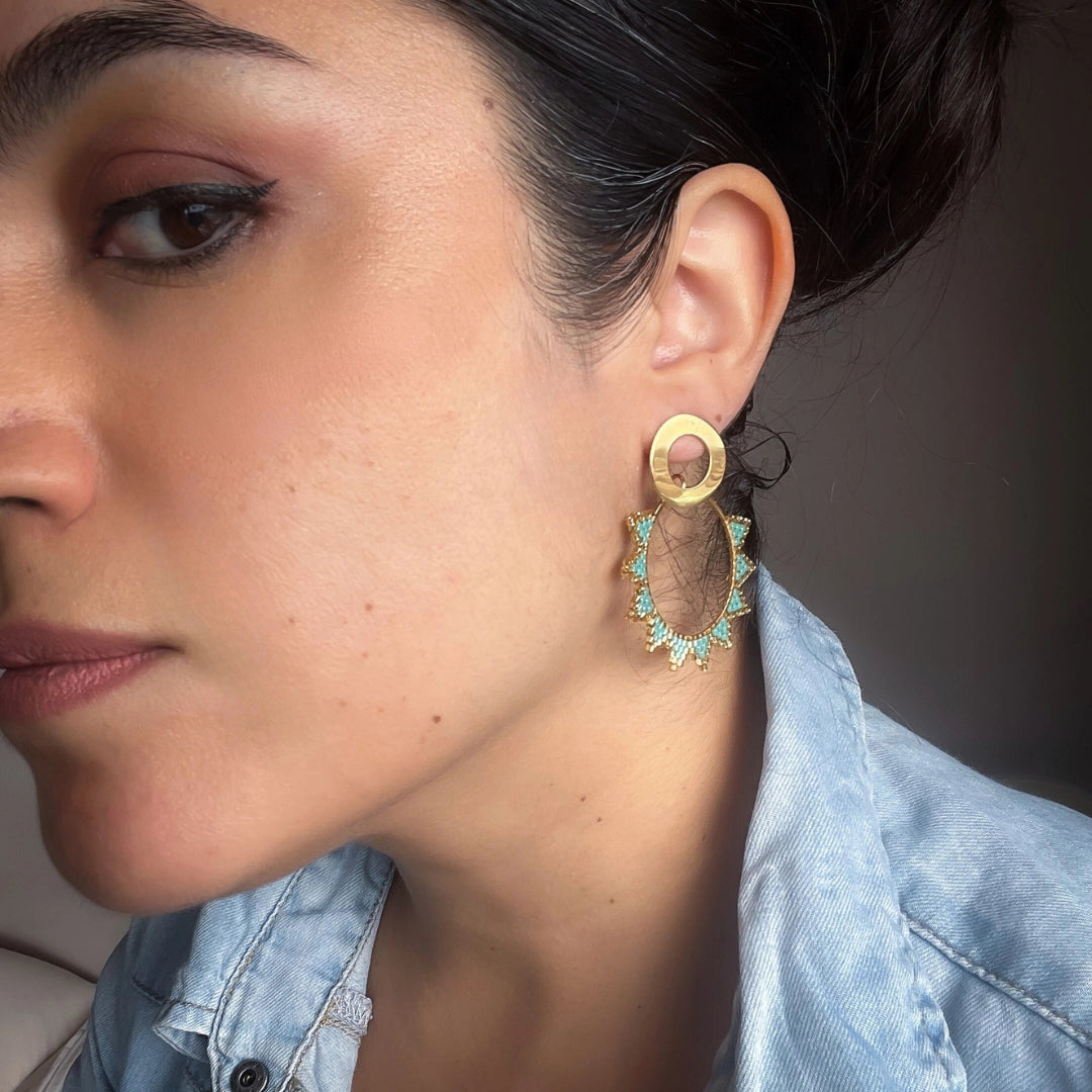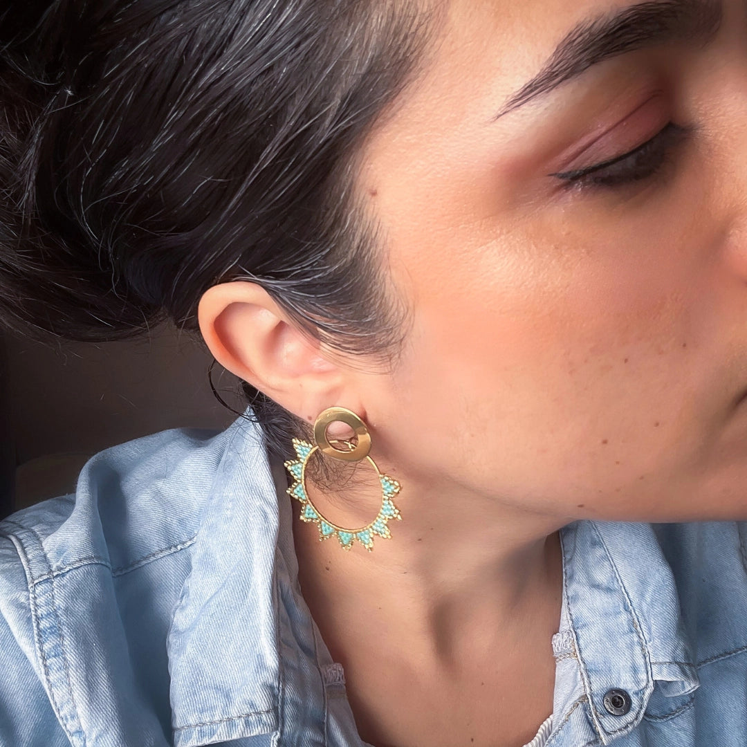 Cada puntada la fui haciendo a mano, una por una, para lograr este diseño que me recuerda al sol. Me encantan porque son livianitos, con mucho movimiento y un brillo que levanta altiro cualquier look.