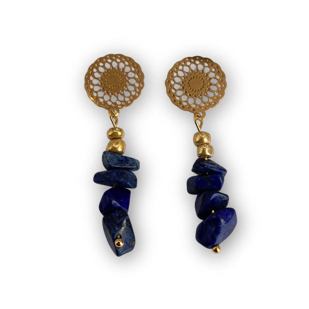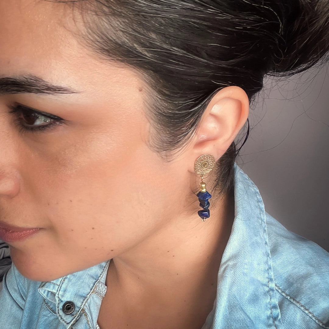 Estos Aros Sol Azul los armé pensando en la mezcla que me encanta: un diseño que recuerda al sol (con ese dorado trabajado), combinado con el azul profundo del lápiz lazuli natural.