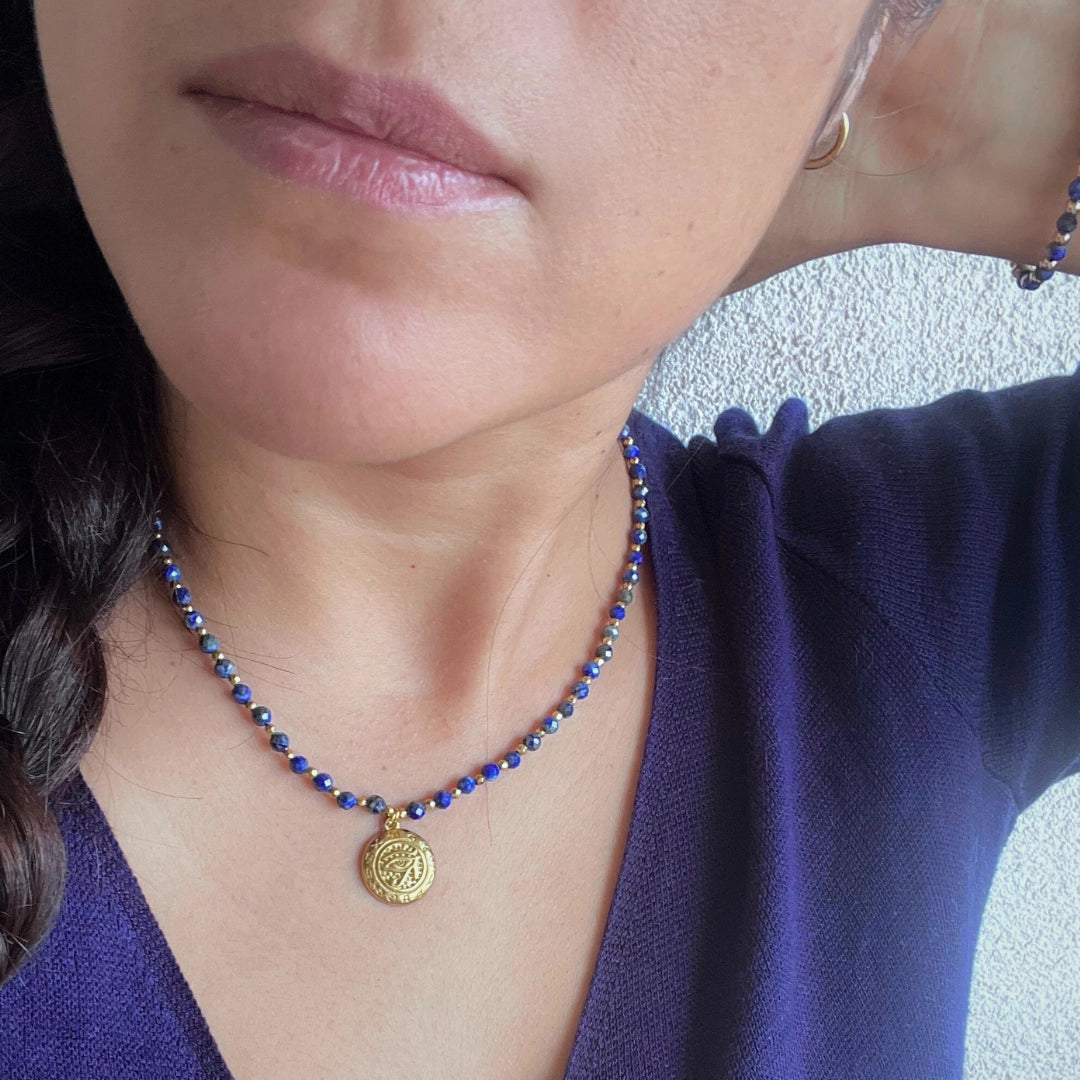 El collar Azura Ra une la energía del cielo nocturno con la luz dorada del sol. El lapislázuli, piedra sagrada de los faraones, simboliza sabiduría y verdad, mientras el Ojo de Ra irradia protección y fortaleza. Cada cuenta y detalle dorado está pensado para acompañarte con energía, belleza y misticismo.