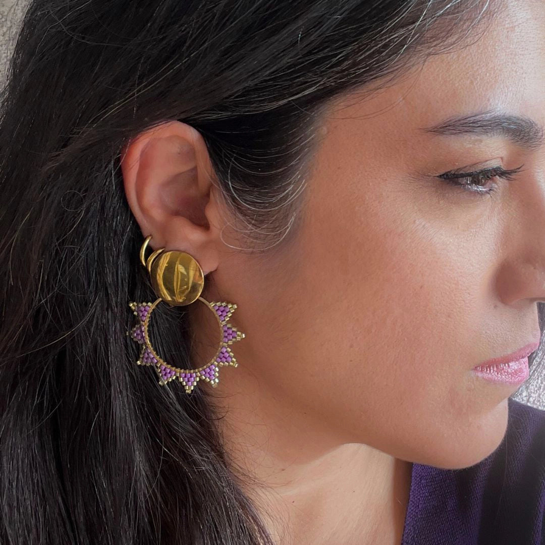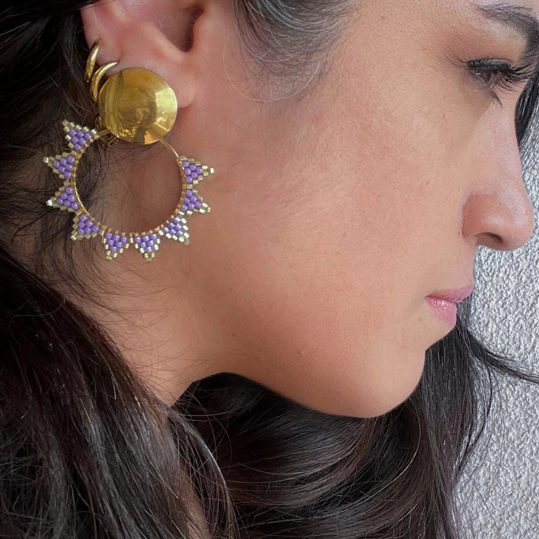 Cada puntada la fui haciendo a mano, una por una, para lograr este diseño que me recuerda al sol. Me encantan porque son livianitos, con mucho movimiento y un brillo que levanta altiro cualquier look.