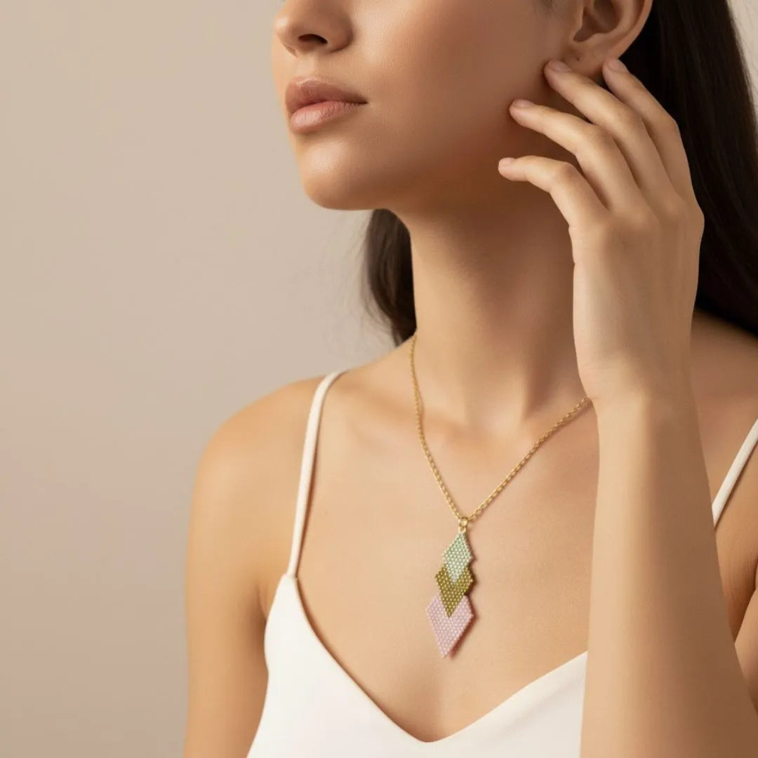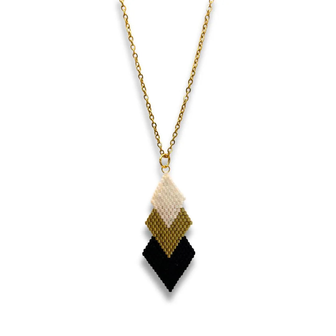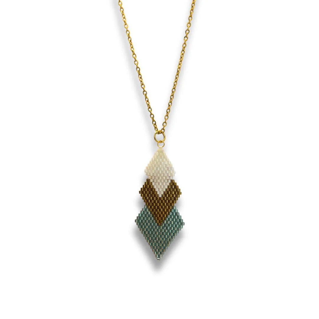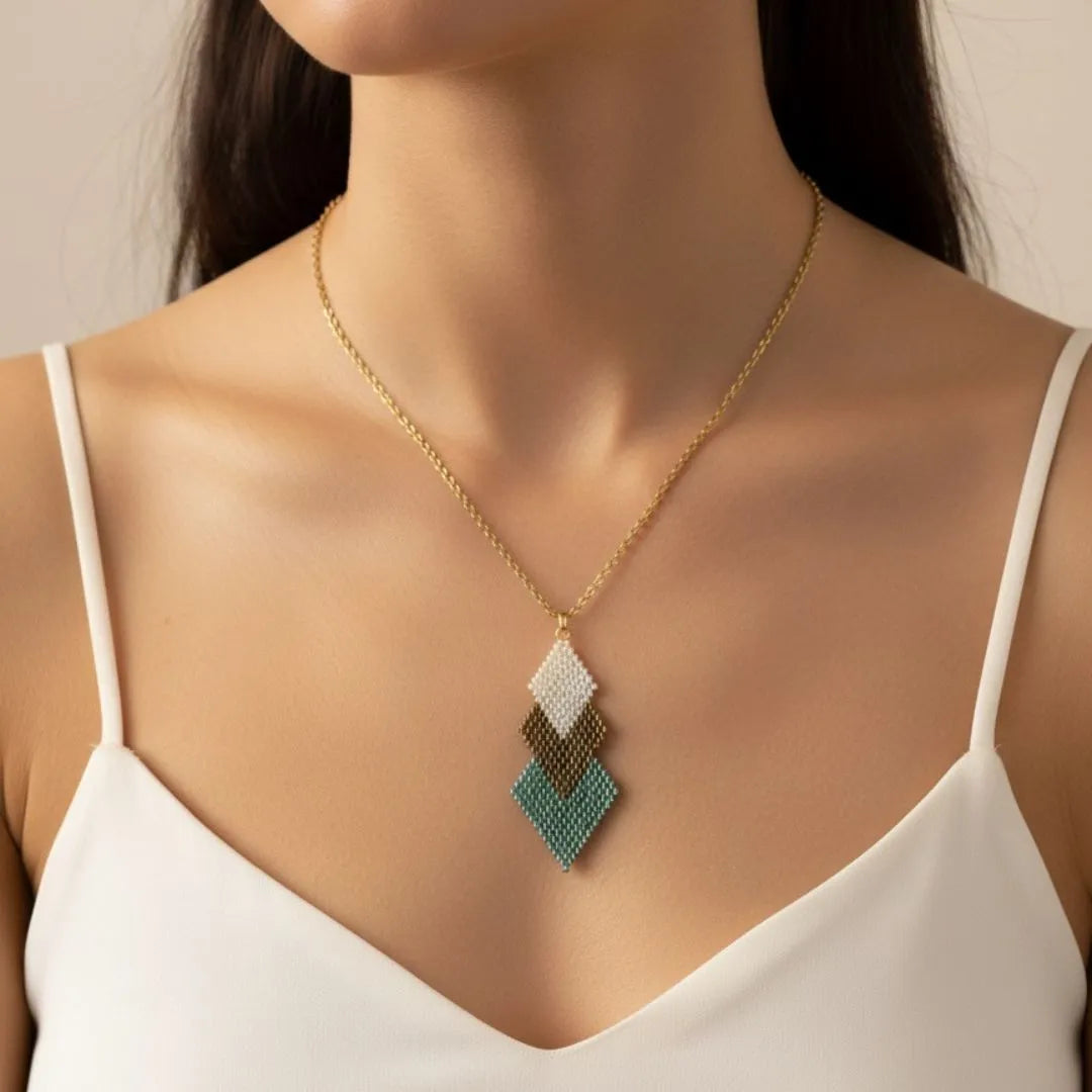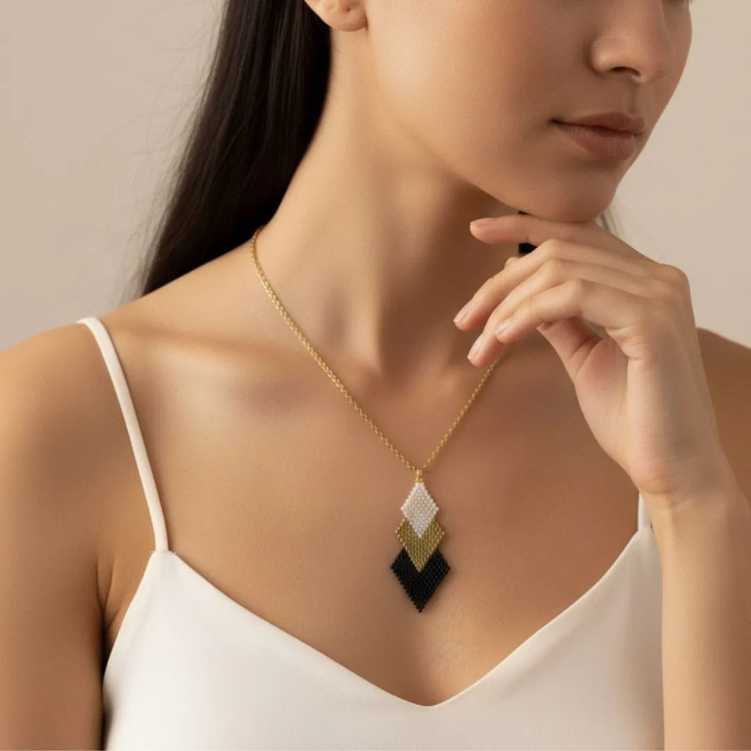 El Sahel evoca el encuentro de culturas y paisajes. Su diseño geométrico en caída, tejido a mano con mostacillas Miyuki y cadena bañada en oro 18k, refleja la fuerza que nace de la diversidad y la belleza de lo auténtico.