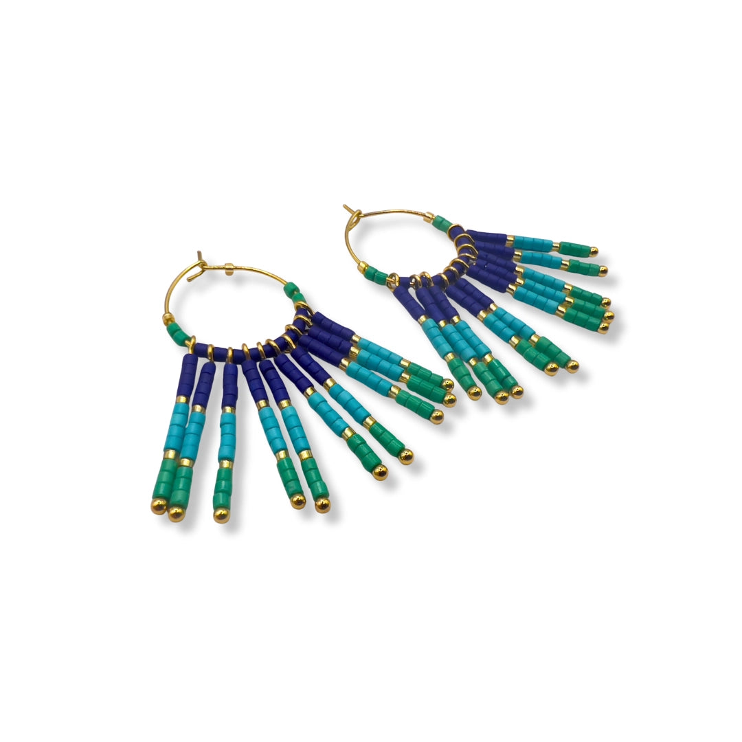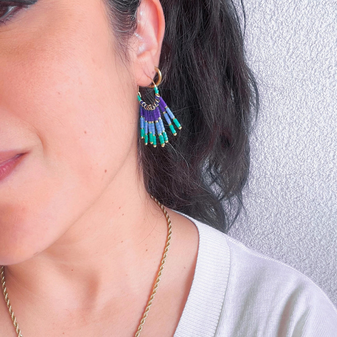 Los Aros Bali fueron creados con mostacillas Miyuki, seleccionadas por su brillo y calidad, y ensambladas a mano en una composición que evoca libertad y frescura. Cada colgante en el aro aporta un pequeño destello que se mueve contigo.