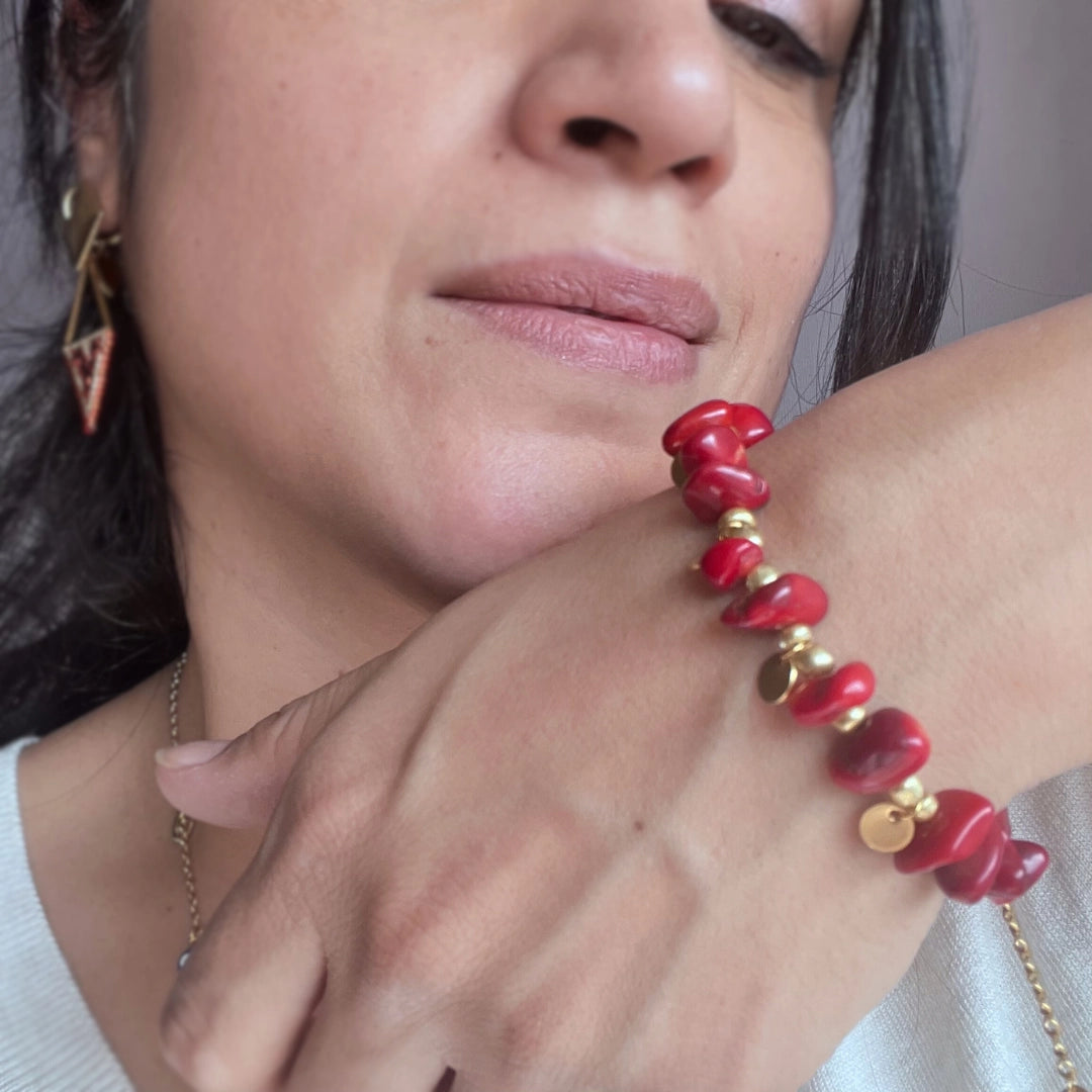 La Pulsera Alya está compuesta por piedras de coral rojo natural, intercaladas con esferas de hematita bañada en oro y pequeños charms que añaden movimiento y luz. Un diseño con carácter, pensado para mujeres que vibran alto y viven con intensidad.